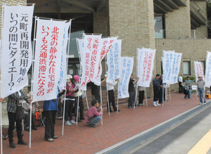 座り込みでは「元町に唯一残された広い市有地で、緑の公園に」などと主張。あわせて市が進める庁舎建て替え計画も「液状化対策を優先し、新庁舎建設は一時中断を」と訴えた。(村上一樹)